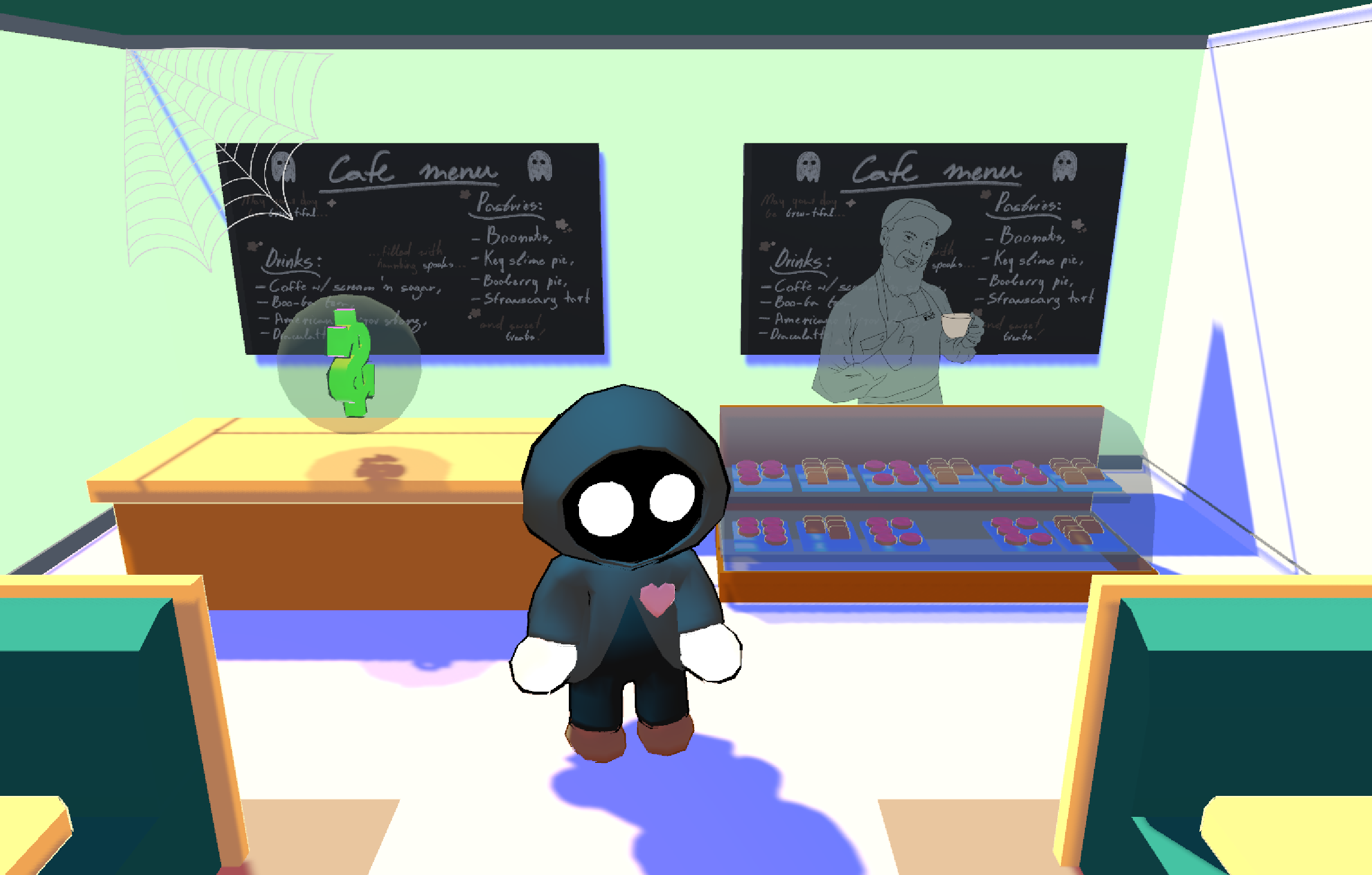 Controls: WASD, E to interact, P/ESC to pause, Space to use Donut, mouse hover to view ghost traits!